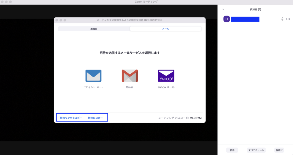 4.「ミーティングに参加するように相手を招待」というウインドウが表示されるので、画面左下にある「招待リンクをコピー」か「招待のコピー」を選択します。