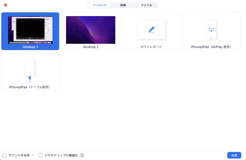 自分のパソコンの中に入っている画像やデータをZoom上で参加者に共有することができます。データとして配布するほどではないけれど見てもらいたい資料を会議中に参考程度に共有する時によく使われます。また自分のデスクトップ自体を共有することもできます。こちらはパソコン・スマホ教室などデバイスの使い方をレクチャーする授業などでもよく使われます。