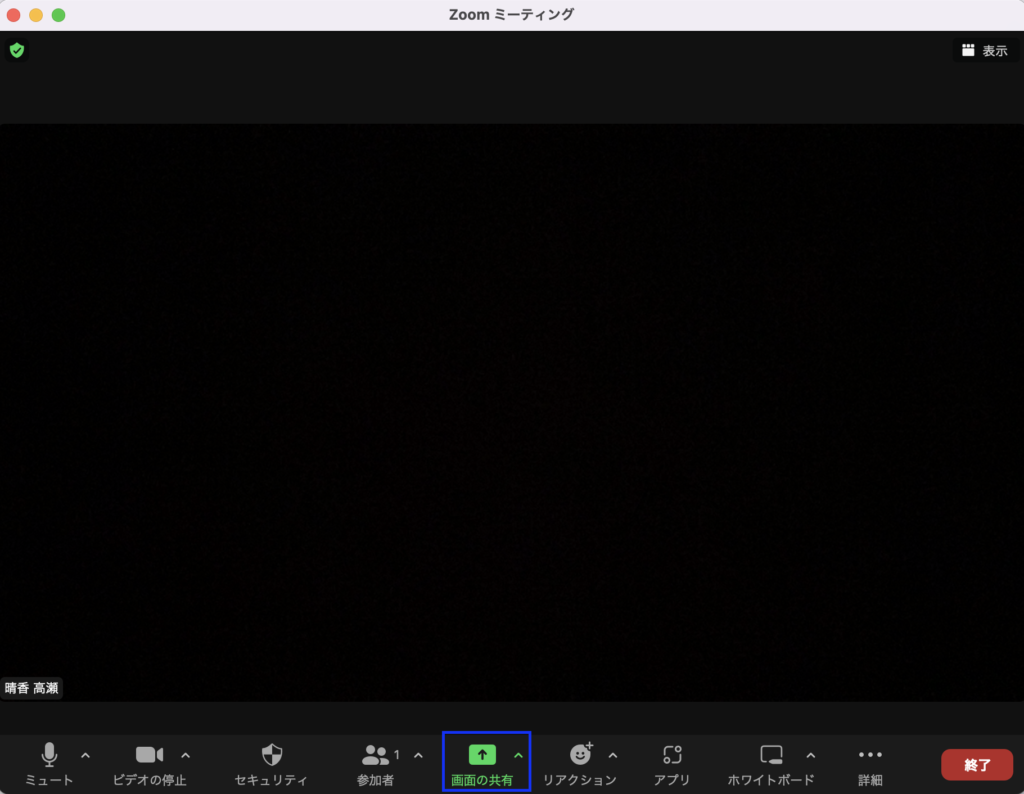 1.ミーティング中に、画面下部に出ている「画面の共有」をクリックします。
