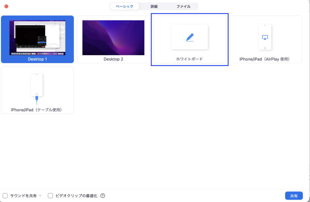 2.「ホワイトボード」アイコンを選択すると共有が開始されます。