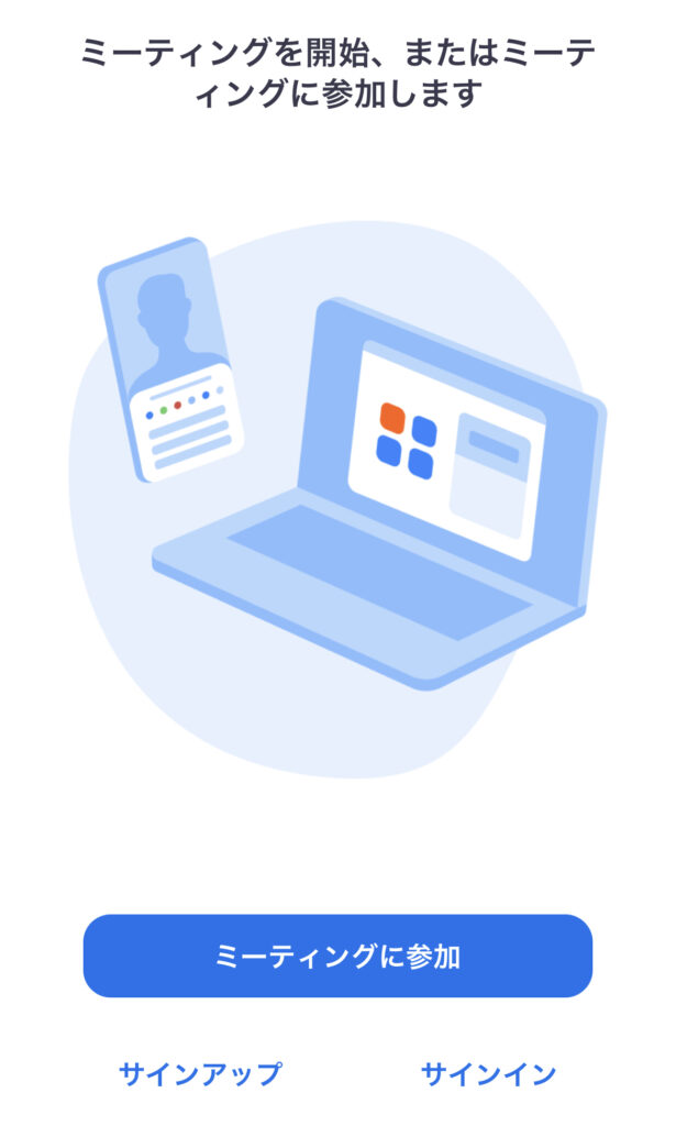 中身は非常にシンプルなデザインになっていて、「ミーティングに参加」「サインイン」「サインアップ」から選択するだけ。これからアカウントを作る場合は「サインアップ」を、すでにアカウントを持っている場合は「サインイン」をタップしてメールアドレスとパスワードを入力します。ちなみに招待されたミーティングに参加するだけの場合はサインアップの必要はありません。